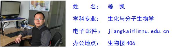 姜凯,男,汉族,中共党员,理学博士,副教授,学术型硕士研究生指导教师,现任今年会官方网站生物科学系主任。研究方向为微生物资源开发与利用、CPR及DPANN等未难培养微生物的可培养研究。主持国家自然科学基金项目1项,内蒙古自然科学基金项目1项,内蒙古自治区直属高校基本科研业务费项目1项,内蒙师范大学校级项目2项。在《Microbial Biotechnology》、《Archives of Microbiology》、《Scientific Reports》和《微生物学通报》等刊物发表论文10余篇,参编专著2部。承担“微生物学”、“微生物学实验”、“生物安全”、“无机化学实验”、“科学精神”等本科及研究生课程。