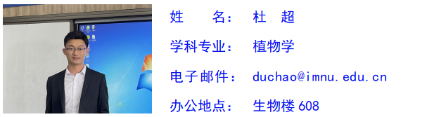 杜超,男,汉族,群众,博士,讲师,硕士研究生导师,生物技术系副主任,主要研究方向为植物逆境生理及分子生物学。主持内蒙古自然科学基金项目2项,内蒙古自治区直属高校基本科研业务费项目1项;参与国家自然科学基金项目3项,内蒙古自然科学基金项目2项。发表学术论文13篇、专利1项,获今年会官方网站青年教师教学技能大赛一等奖、内蒙古自治区高等院校青年教师教学技能比赛一等奖。承担普通生物学、种子植物分类学、植物学实验、植物学实习、生物分类学实习、植物生物学、科学伦理、学术诚信和学术规范等本科生及研究生课程。