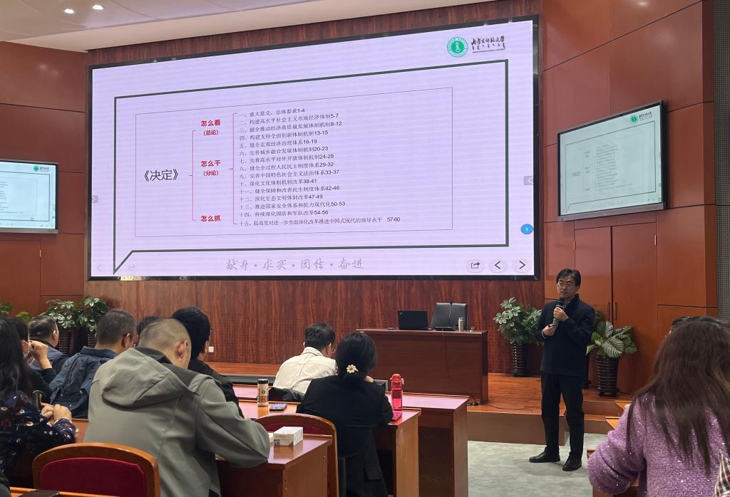 宣讲会上,张瑞军教授聚焦习近平总书记在党的二十届三中全会上的重要讲话和《中共中央关于进一步全面深化改革、推进中国式现代化的决定》,系统阐述了进一步全面深化改革的重要性、必要性,紧紧围绕“改革成效”、“为什么改”、“往哪里改”、“怎么去改”宣讲了全面深化改革的主题、重大原则、重大举措、根本保证。宣讲内容详实、条理清晰,对于学院全体教师准确理解、全面把握党的二十届三中全会精神具有重要指导意义。下一步,学院党委将持续推进把学习宣传贯彻党的二十届三中全会精神和全国教育大会精神及习近平总书记关于教育的重要论述结合起来,进一步坚定信心、振奋精神,带动全院师生以更加饱满的热情和更加务实的作风,为推动学校、学院高质量发展贡献力量。