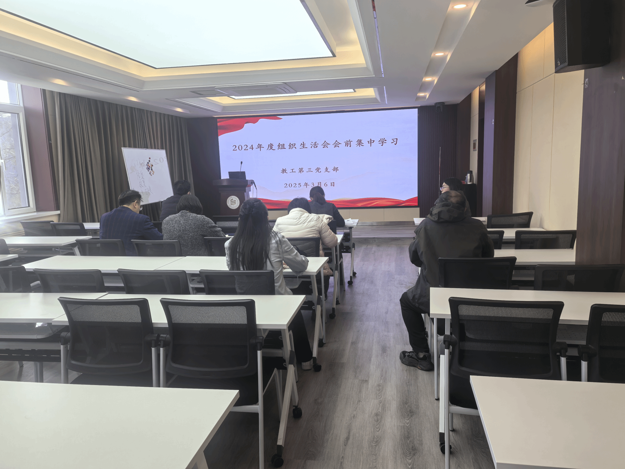 3月6日,支部召开组织生活会前集体学习会。会议聚焦深入学习习近平新时代中国特色社会主义思想、党的二十届三中全会精神、《中共中央国务院关于弘扬教育家精神加强新时代高素质专业化教师队伍建设的意见》等重要内容,旨在进一步统一支部党员思想,深化认识,为高质量开好支部组织生活会筑牢坚实的思想根基。支部书记吴艳玲及宣传委员郭金停分别对党的二十届三中全会精神和《中共中央国务院关于弘扬教育家精神加强新时代高素质专业化教师队伍建设的意见》进行了详细领学。