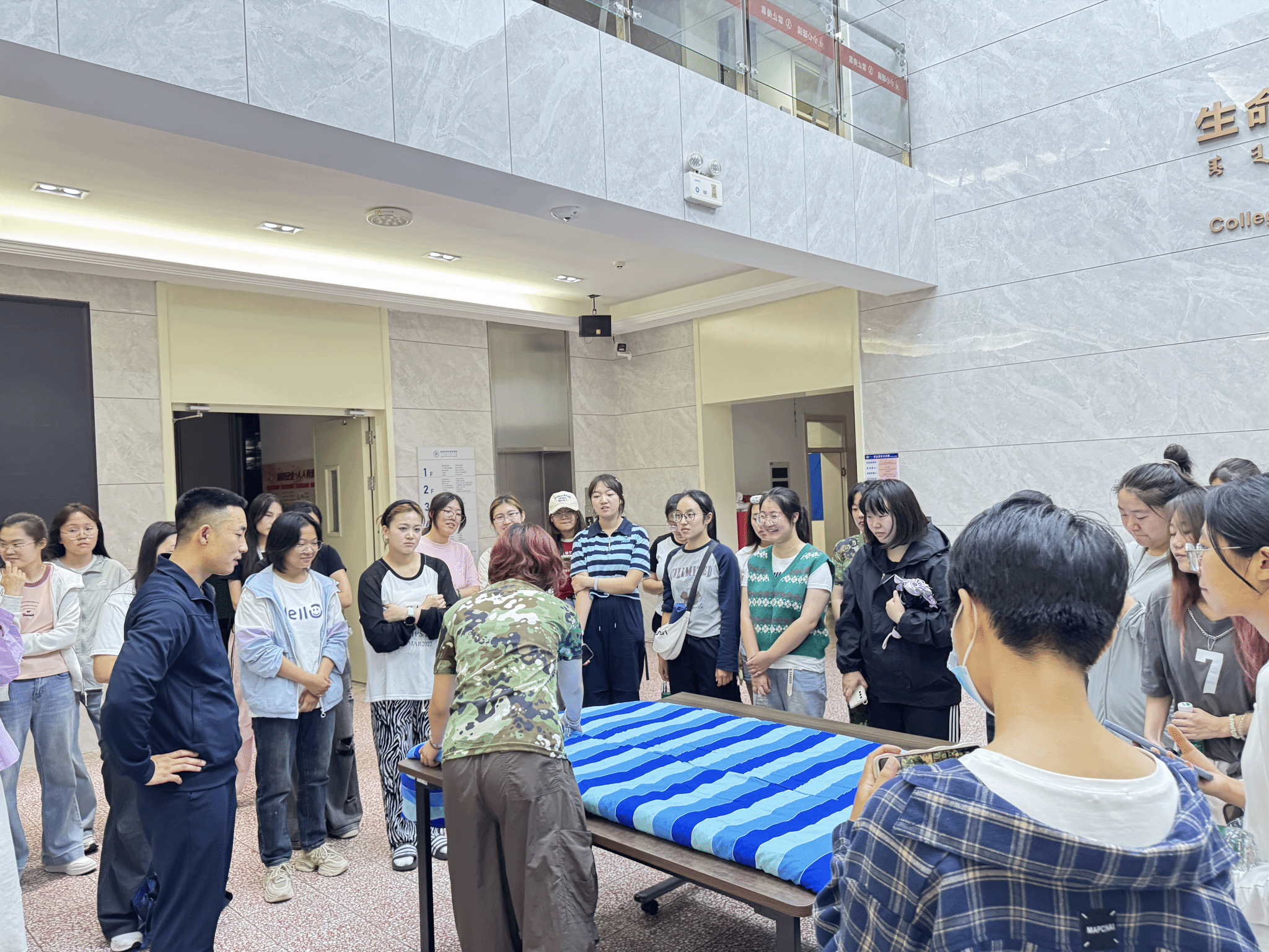 邀请到了退伍大学生今年会官网2025级学硕班李德龙同学给新生们展示“豆腐块”式军被的叠法。学长手把手地示范动作要领,从铺平、折角到压实、定型,每一个步骤都需要耐心与细致。军训不仅锻炼身体,更是对意志品质和生活习惯的磨砺。
